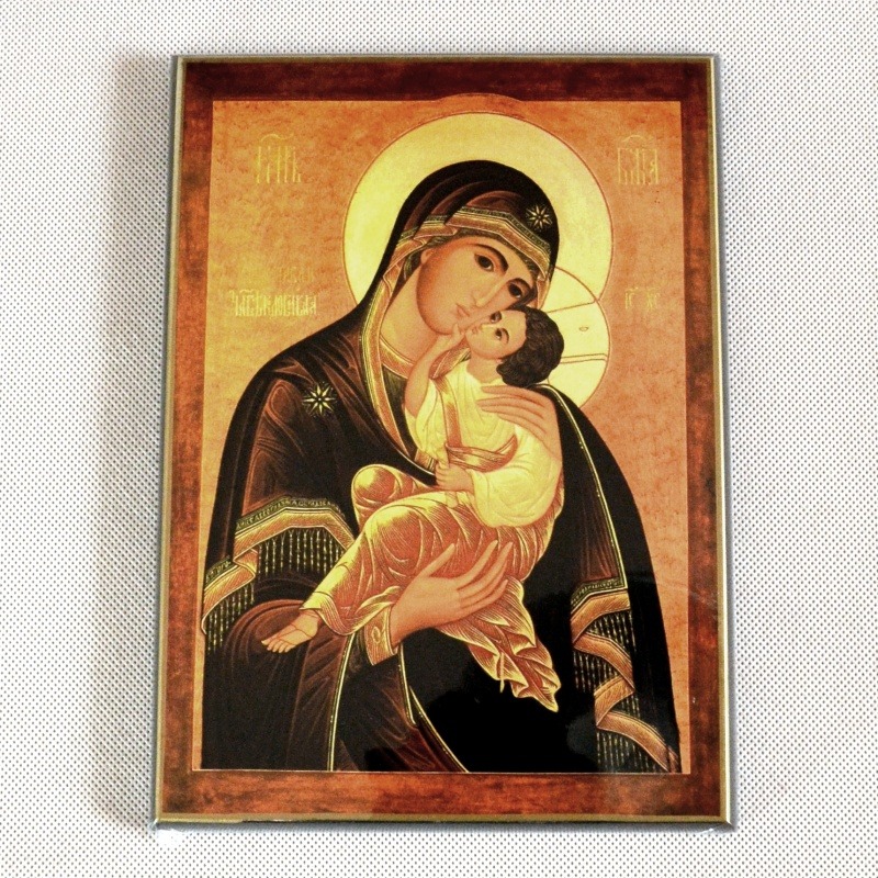 Tato ikona Bohorodičky v "něžném" pojetí vyjadřuje hlubokou lásku a pouto mezi Matkou Boží a malým Ježíšem. Tradiční ikonografický styl v kombinaci s masivním dřevěným podkladem vytváří důstojný a posvátný předmět vhodný jako ústřední bod domácí modlitby. Rozměr 20 x 30 cm dává vyniknout všem detailům tohoto posvátného zobrazení. Ikona je řemeslně zpracována s důrazem na kvalitu a dlouhověkost. Skvěle poslouží jako hodnotný dar k svatbě, biřmování nebo jako požehnání do nového příbytku. Přinese do vašeho domova atmosféru klidu, pokory a neustálé Boží přítomnosti.