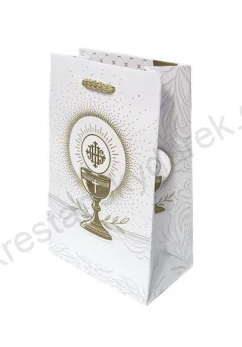 Dárková taška v lesklé bílé barvě se zlatým motivem kalicha vhodná nejen k prvnímu svatému přijímání. Krásně doplní Váš dárek nejen k prvnímu svatému přijímání.