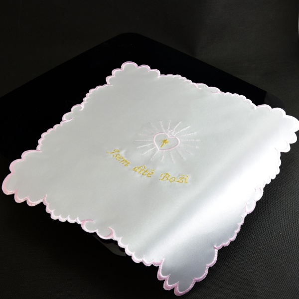 Něžná křestní rouška se symetrickým čtvercovým tvarem nese krásnou růžovo-zlatou výšivku kříže v srdci. Je vyrobena z jemného bílého saténu a pečlivě obšita, aby podtrhla svátečnost okamžiku, kdy dítko přijímá svou první svátost. Růžová barevnost výšivky je ideální volbou pro křest holčičky, kterému dodá nádech čistoty a nevinnosti. Rouška představuje symboliku čistého štítu a Boží přízně, kterou si pokřtěný odnáší do života. Tato originální výšivka nese text "Svátost křtu" nebo "Jsem Boží dítě" a stane se milovaným rodinným pokladem, uchovávajícím vzpomínku na tento posvátný den.