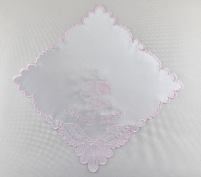 Křestní rouška čtvercová - obšívaná, s růžovo stříbrnou výšivkou, vzor HolubičkaSkladem 2219 Kč181 Kč bez DPH