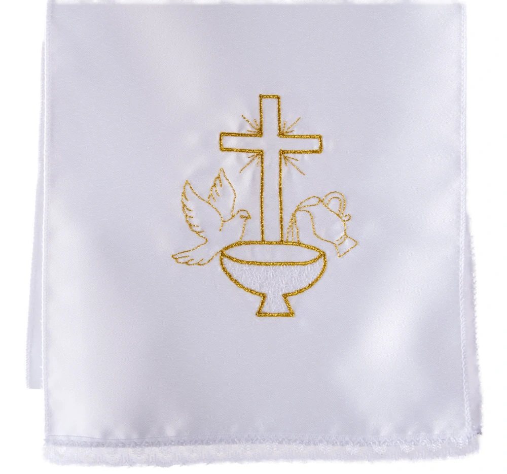 - Křestní rouška (stuha) pro dospělé, vyšívaná - motiv Křtitelnice, holubice, džbán (bílo zlatá)
