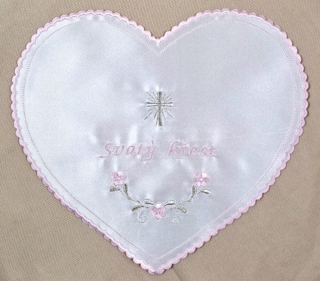 Něžná křestní rouška ve tvaru srdce (cca 30 x 27 cm) s růžovo-stříbrnou kombinací výšivky je krásným symbolem nového začátku a Boží lásky. Ústřední motiv zářícího srdce a nápis "Svátost křtu" připomínají pokřtěné dívce její novou důstojnost a čistotu před Boží tváří. Bílé saténové provedení v kombinaci s netradičním tvarem dělá z této roušky skutečný unikát. Křestní bílé roucho má nově pokřtěný nosit bez poskvrny celým svým životem a tato rouška ve tvaru srdce mu to bude navždy připomínat. Je to vynikající volba pro rodiče a kmotry, kteří chtějí zdůraznit citovou hloubku křestního obřadu. Rouška zůstane vzácnou památkou na okamžik, kdy dítko přijalo svátost znovuzrození a stalo se navždy součástí nebeského království.