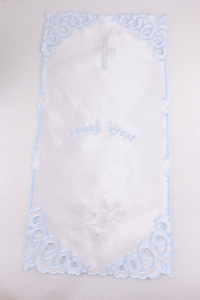 Tato vyšívaná rouška větších rozměrů je určena pro slavnostní den křtu starších dětí i miminek. Jemná stříbrno-modrá výšivka dvou holubiček u křtitelnice symbolizuje nový život z Ducha svatého a duchovní čistotu. Vysoce kvalitní satén a precizní zpracování dodávají rouchu vznešený charakter. Rouška zůstává rodině jako drahocenná památka na den sjednocení s Kristem a jako symbol slibu kráčet ve světle víry. Je to vkusný a uctivý dar od kmotrů, který krásně vynikne na křestních fotografiích.