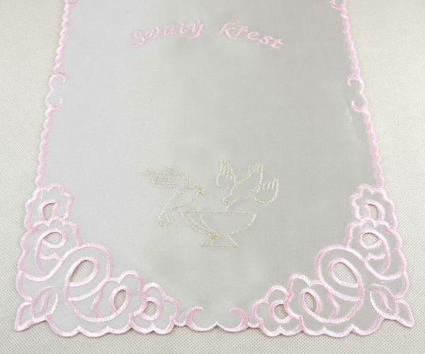 Větší křestní rouška se stříbrno-růžovou výšivkou, růžovým lemem a motivem dvou holubiček u křtitelnice je jemnou a slavnostní součástí křestního obřadu. Holubičky připomínají Ducha svatého a čistotu srdce, která je křtem obnovena, zatímco stříbrný tón evokuje světlo víry a důstojnost svátosti. Růžový lem dodává roušce něžný, rodinný charakter. Díky větším rozměrům 46 × 23 cm je rouška vhodná i pro křest větších dětí. Jako památka se často uchovává po celý život a vrací se do rodiny při dalších svátostech či výročí křtu. Je to krásný dar od kmotrů i citlivě zvolená křestní výbava s osobitým vzhledem.
