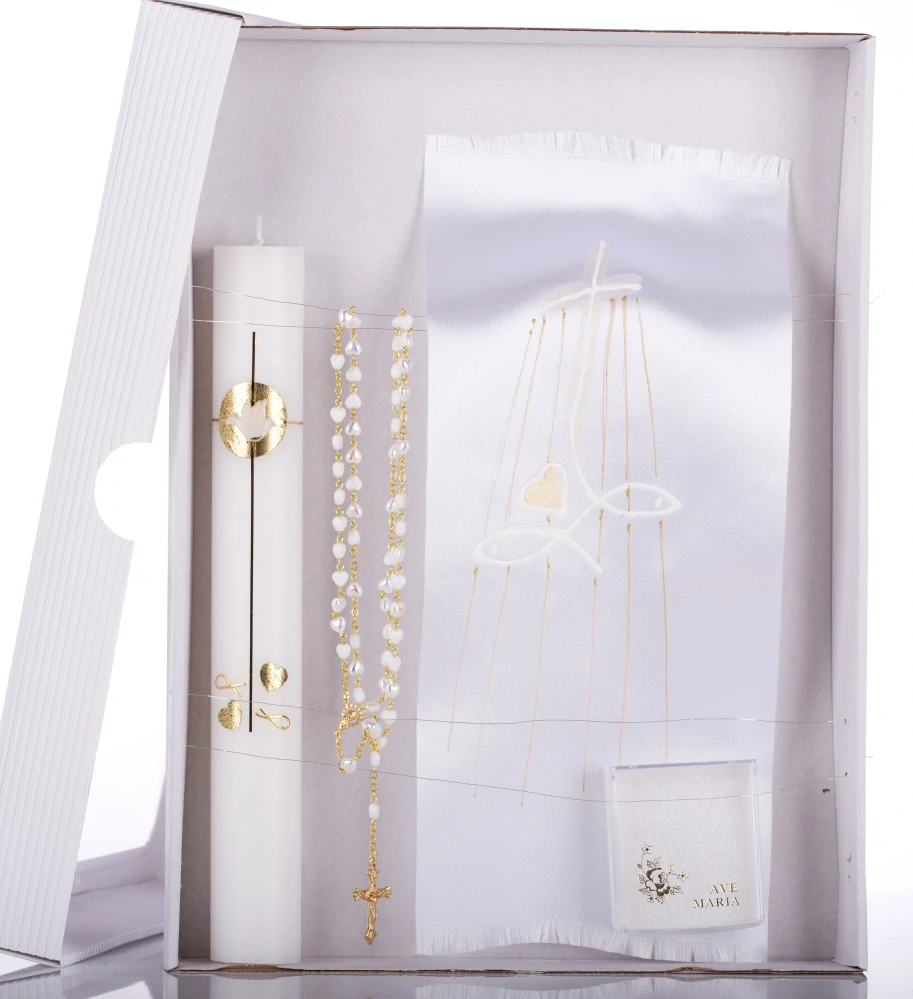 Křestní dárková sada obsahuje ručně zdobenou svíci s motivem holubice, zlatých srdíček a tradičním symbolem rybek. Dále je v ní ručně malovaná křestní rouška s motivem "rybičky pod křížem" a růženec z Jabloneckých perliček ve tvaru perleťových srdíček se zlatým ketlováním. Růženec je doplňen bílou krabičkou "Ave Maria" pro další uchování. Tato elegantní křestní sada je jemná a nadčasová a nadchne ručním zpracováním. Všechny součásti jsou navíc vyrobené v České republice.