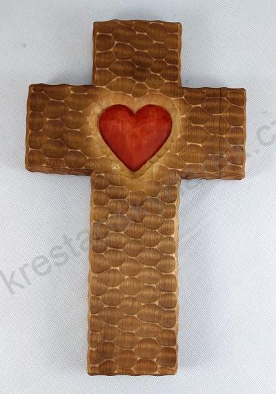 Kříž dlabaný "Srdce" - 16 cm - Tmavě hnědá červené srdce