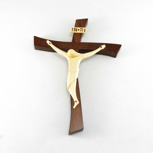 Moderní nástěnný kříž o výšce 26 cm vyniká svým unikátním zvlněným tvarem, který do interiéru vnáší dynamiku a eleganci. Kombinace tmavého dubového dřeva a světlé lípy vytváří harmonický kontrast, který dává vyniknout vyřezávané siluetě Krista. Tento kříž je důstojným a zároveň umělecky hodnotným symbolem víry. Slovenská řemeslná práce s důrazem na detail zaručuje unikátnost každého kusu. Kříž je vhodným darem k biřmování, svatbě nebo jako dominantní duchovní prvek pro váš nový domov. Připomíná Kristovu oběť v moderním pojetí, které osloví i mladší generace věřících.