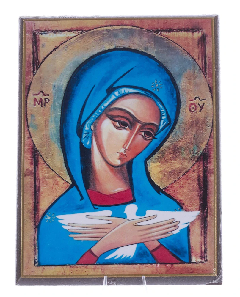 Krásný obraz na dřevě ve formě ikony zobrazuje Pannu Marii, která má v dlaních holubici jako symbol Ducha svatého.