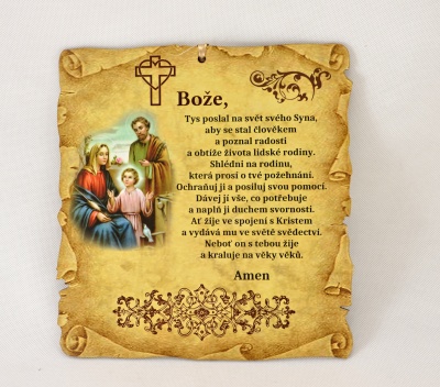 Tento barevný obrázek na dřevě nese text modlitby za rodinu a prosbu o nebeské požehnání pro váš domov. Tradiční italský design v pergamenovém stylu dodává dekoraci sváteční a uctivý vzhled. Je to krásný dar pro novomanžele nebo k posvěcení nového příbytku, který vybízí k pravidelnému společnému ztišení.
