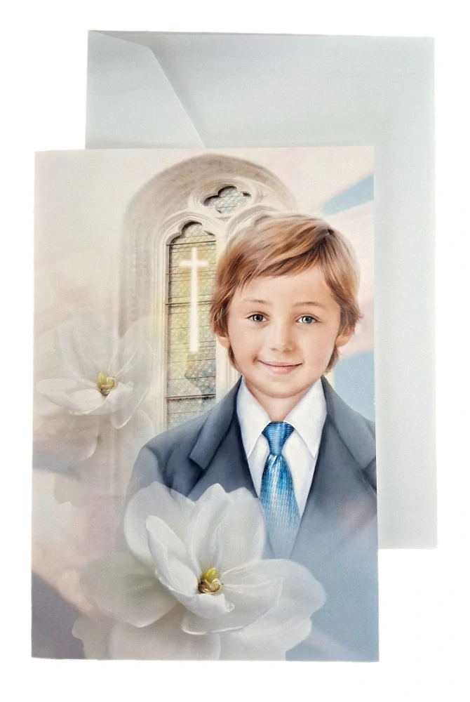 Skládané přáníčko o formátu A6 s jemným motivem chlapce v modrém odstínu je určeno k vyjádření radosti z prvního přijetí Ježíše v Eucharistii. Čistý a sváteční design na kvalitním papíře podtrhuje nevinnost a důležitost tohoto duchovního milníku v životě chlapce. Součástí balení je i obálka pro váš osobní vzkaz, který si obdarovaný rád přečte i po mnoha letech. Toto přání je krásným způsobem, jak popřát hojnost Božích milostí a vyprosit nebeskou ochranu pro mladého křesťana. Vepsaná slova povzbuzení zůstanou drahocennou připomínkou na jeho velký slavnostní den.