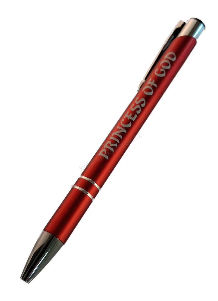 Kovová propiska s nápisem "Princess of God" - Boží princezna, modrá náplň, délka 13,5 cm.