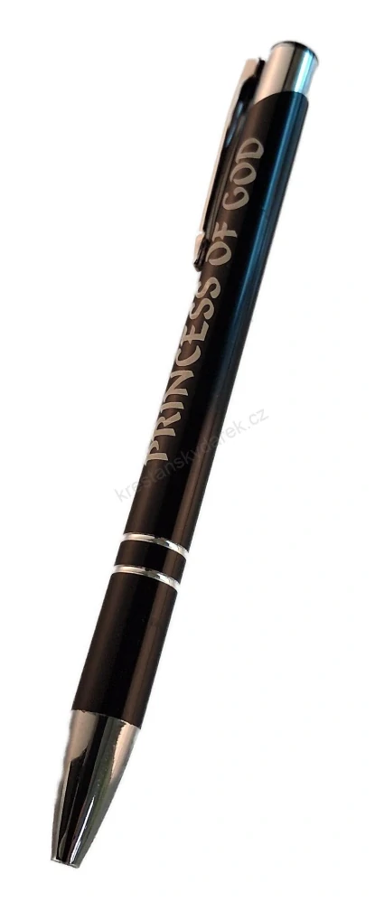 Kovová propiska s nápisem "Princess of God" - Boží princezna, modrá náplň, délka 13,5 cm.