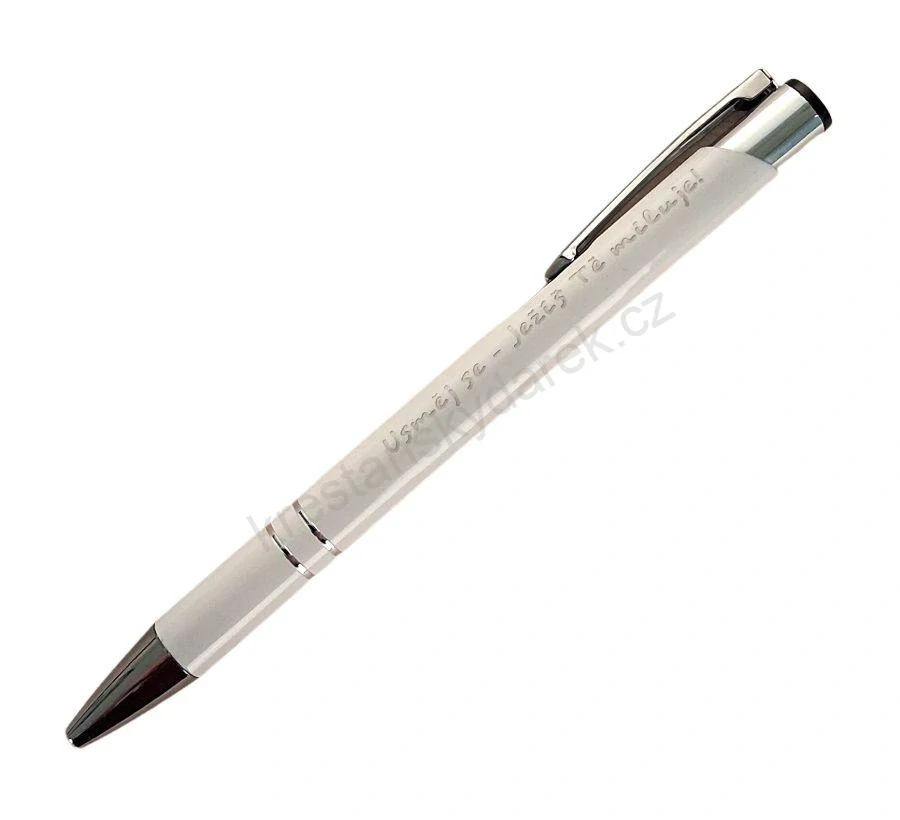 Krásné kovové propisky v modré a bílé barvě s nápisem "Usměj se - Ježíš tě miluje". Potěší jako milá pozornost každého blízkého. Náplň propisky má modrou barvu.