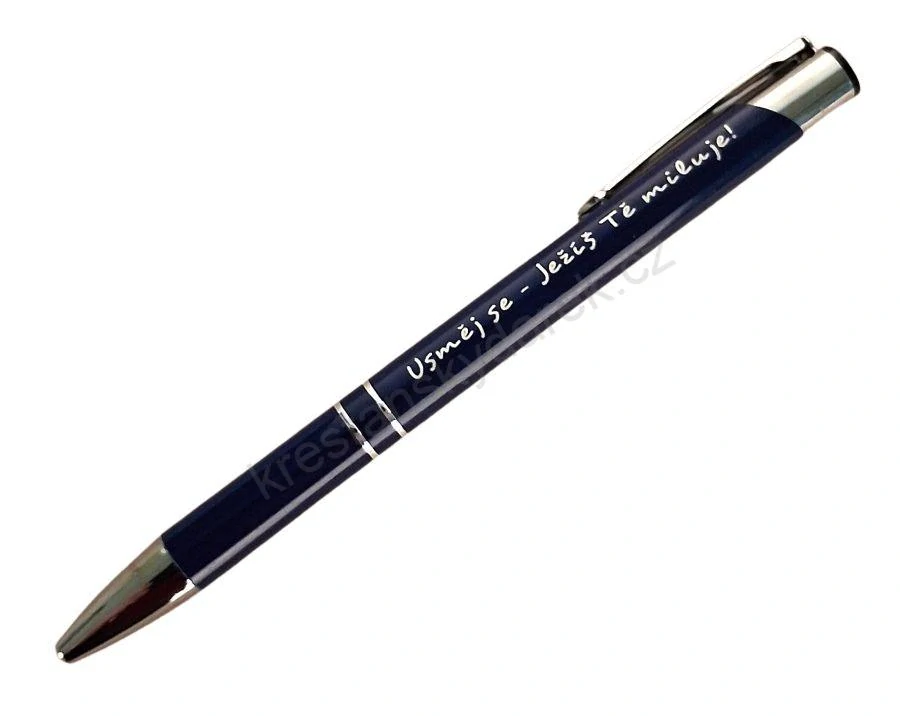 Krásné kovové propisky v modré a bílé barvě s nápisem "Usměj se - Ježíš tě miluje". Potěší jako milá pozornost každého blízkého. Náplň propisky má modrou barvu.
