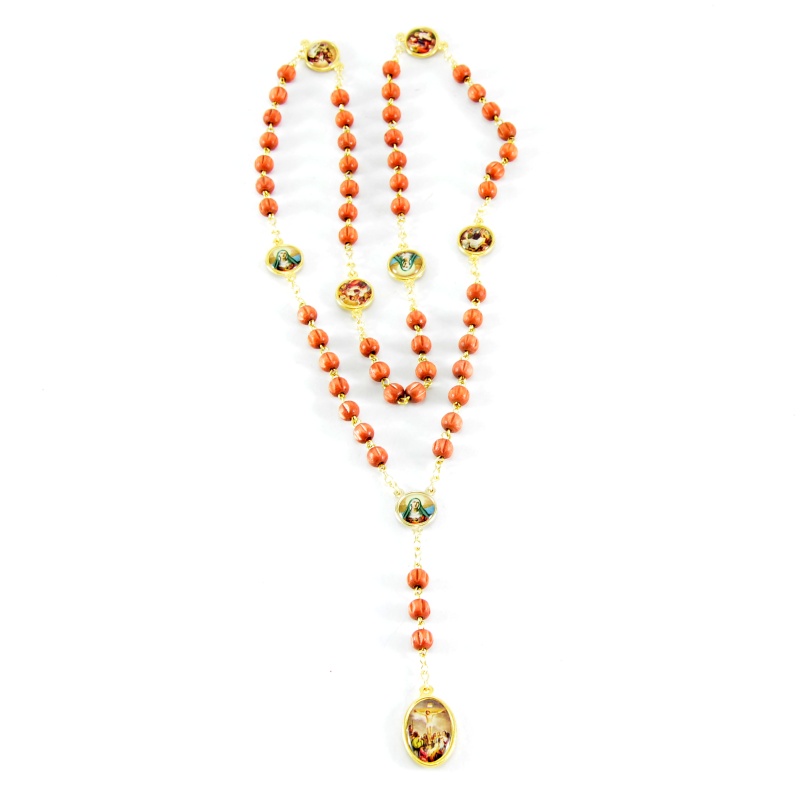 Tento sedmibolestný růženec s tmavě hnědými perličkami je určen k hlubokému rozjímání nad bolestmi Panny Marie. Mezi desátky se nacházejí oboustranné celokovové medailonky, které názorně zobrazují jednotlivá tajemství a pomáhají k soustředěné modlitbě. Kvalitní stříbřité ketlování a uctivé provedení medailonků dodávají růženci vznešený a tradiční vzhled. Modlitba sedmibolestného růžence přináší útěchu v těžkých chvílích a učí nás spojovat naše utrpení s Kristovým křížem po vzoru Jeho Matky. Růženec je ideálním darem pro ctitele Panny Marie, biřmovance nebo jako posila pro nemocné a trpící. Přírodní materiál dřeva a vážnost medailonků vnášejí do chvil usebrání duchovní hloubku a pokoj.