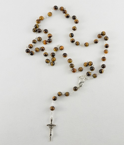 Důstojný růženec z korálků tygřího oka s jeho charakteristickým zlatohnědým leskem je symbolem síly a Boží ochrany. Přírodní kámen o velikosti 7 mm dodává modlitbě hloubku a klid, přičemž je velmi příjemný na dotek při každém zrnku. Růženec je uložen v poloprůhledné krabičce s motivem růže a nápisem Ave Maria, což z něj činí hotový dárek připravený k předání. Je to skvělý dárek pro muže i ženy k biřmování, narozeninám nebo na důležité životní cesty. Kvalitní zpracování zaručuje dlouhou životnost a stálost materiálu. Tento růženec bude majiteli věrným společníkem při tichém rozjímání a tichým svědectvím o jeho víře v každodenním životě.