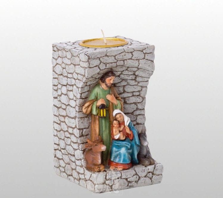 Menší svícen na čajovou svíčku ve tvaru stáje vytvoří doma hřejivé světlo, které krásně ladí s vánočním ztišením. Jemná záře svíčky dokreslí atmosféru betléma i slavnostního stolu a připomene pokoj noci, kdy se narodil Spasitel. Svícen je z polyresinu ve vzhledu kamenné zídky a má výšku cca 8 cm. Je ideální jako milý dárek na adventní čas – drobný, ale s hlubokým poselstvím.