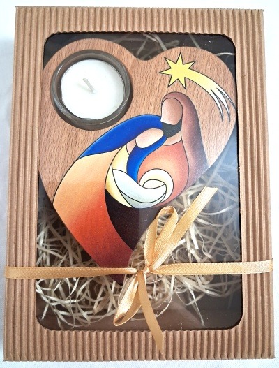 Barevná varianta dřevěného vánočního svícnu přináší do sváteční výzdoby radost a veselou atmosféru. Výjev Svaté rodiny o rozměrech 15 x 12 cm je oživen jemnými barvami, které podtrhují vlídnost a teplo betlémského příběhu. Svícen je určen pro standardní čajovou svíčku, která po zapálení krásně prosvětlí celou scénu a navodí pocit sváteční pohody. Díky estetickému dárkovému balení je tento svícen připraven k okamžitému obdarování vašich blízkých během adventních návštěv nebo pod stromeček. Je to milý dar, který potěší oko i srdce a stane se oblíbenou součástí vánočních tradic. Barevné provedení osloví zejména děti, kterým tak srozumitelnou a hřejivou formou připomene zázrak narození Ježíška v rodinném kruhu.