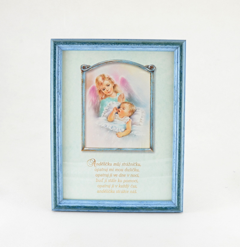 Tento něžný dětský obrázek v modrém rámečku zobrazuje anděla strážného bdícího nad dětmi a je doplněn o krátkou modlitbičku. Je stvořen k tomu, aby přinášel pocit bezpečí a nebeské ochrany do pokojíčku každého malého chlapce. Zasklené provedení v kvalitním rámu zajišťuje trvalou hodnotu a krásu dekorace. Obrázek slouží jako skvělá pomůcka při učení prvních modliteb a ranním i večerním odevzdávání se do Božích rukou. Je to tradiční a oblíbený dar ke křtu nebo k narození dítěte, který bude obdarovaného provázet po celou dobu jeho dětství.