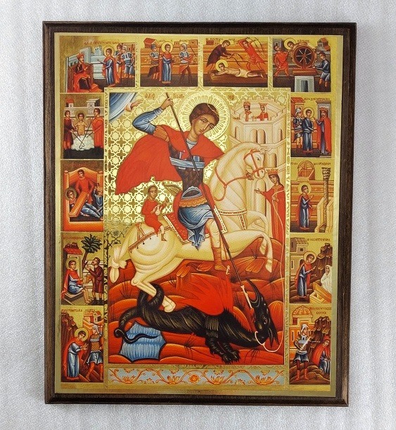Tato majestátní výpravná ikona zachycuje svatého Jiřího, udatného vítěze nad zlem a ochránce víry. Na masivní dřevěné desce s elegantním frézovaným rámečkem je umístěn zlacený výjev svatého Jiřího na koni, který je obklopen dvanácti detailními scénami z jeho hrdinského života a mučednictví. Ikona o rozměru 20 x 30 cm vyniká precizním zpracováním a hlubokou duchovní hloubkou.nnSvatý Jiří je vzorem odvahy a vytrvalosti pro každého "bojovníka" v běžném životě. Tato ikona je proto ideálním a důstojným darem pro skauty, vojáky, k biřmování nebo jako posluenství při vstupu do nové životní etapy. Umístění této ikony na čestné místo v domově připomíná vítězství pravdy a Boží moci nad každou těžkostí a vybízí k vytrvalé modlitbě o sílu v našich osobních duchovních zápasech.